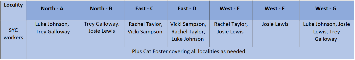 Locality working: Our staff work in localities to support young people who are referred to our service. (Please note: If we have staff absence, workers may have to cover different localities). Please see the list below to find out which workers are linked to your school. You can see photos of our staff here.